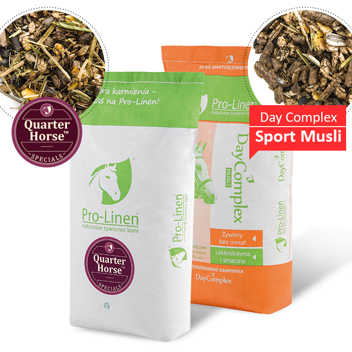 Pro-Linen Day Complex Quarter Horse Musli™ jest paszą strukturalną wolną od owsa , w zamian za to zawierającą komponenty bogate we włókna pokarmowe. Wysoki udział lucerny i suszów owocowych oraz wysłodków buraczanych pomógł w mieszance obniżyć zawartość skrobi, dzięki czemu podawana pasza nie powoduje u koni efektu nadpobudliwości. Dodatek wartościowych olejów w połączeniu z dużą zawartością włókien pokarmowych zapewnia odpowiedni poziom energii, która jest wolno uwalniana. > więcej informacji